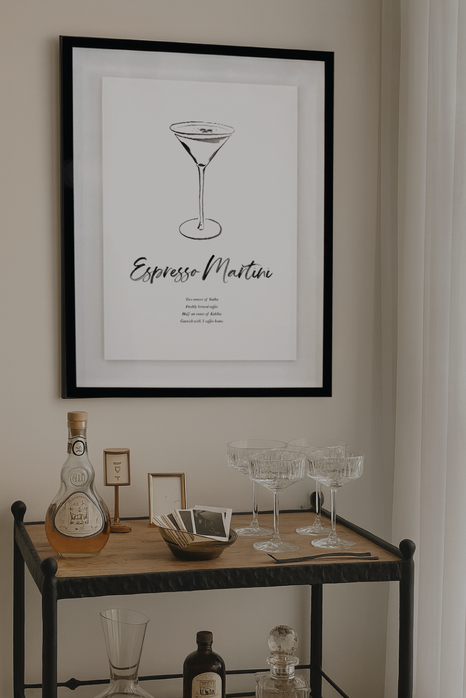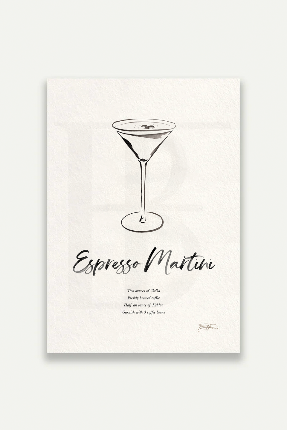 Bring a touch of indulgent calm into your space with this minimalist Espresso Martini illustration, hand-painted in Indian ink using a traditional calligraphy brush. Its clean lines and soft textures capture the quiet ritual of a well-crafted drink — a moment of pause in the midst of busy days. Layers of ink add richness and depth that a digital image simply cannot replicate.